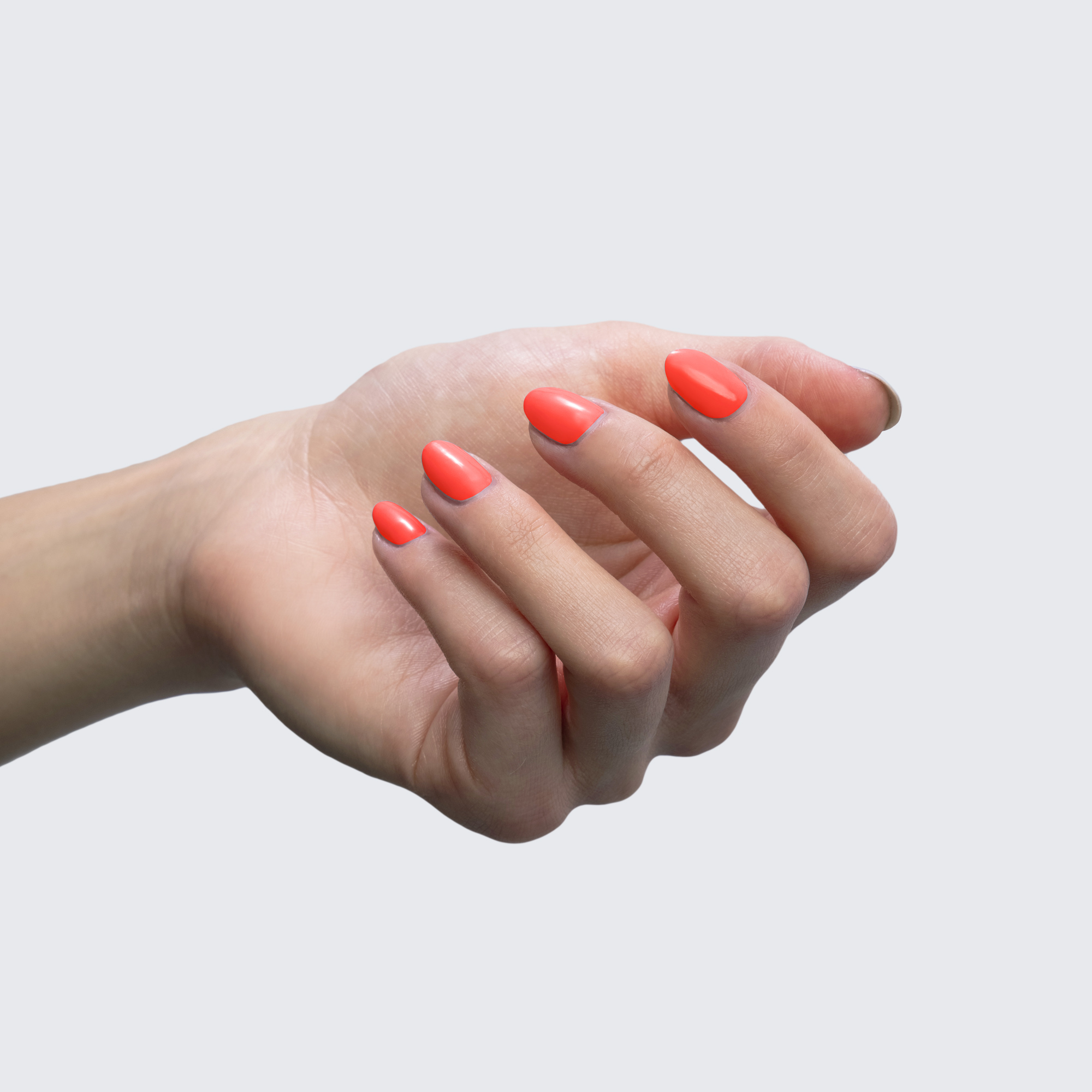 Neon orange. Bright. Cool undertone. Medium opacity / “coverage”.